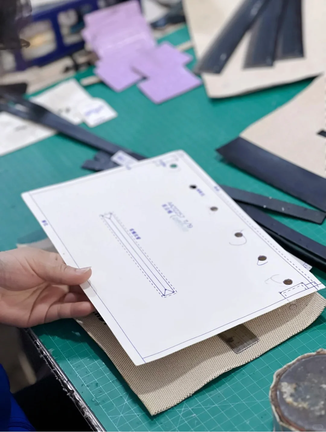 Securing the fabrics, leathers, and hardware that will bring the design to life.
